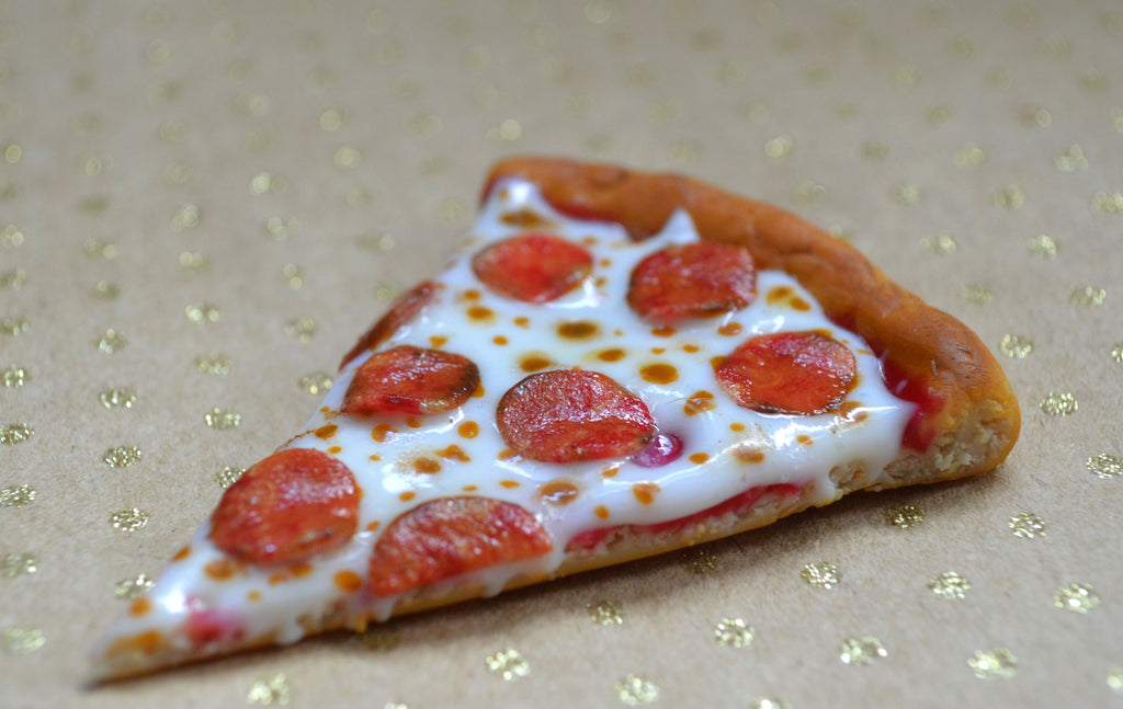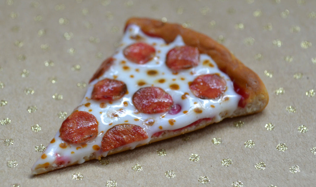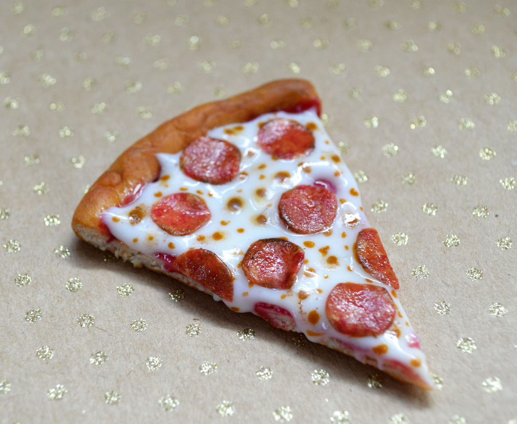 This yummy miniature pizza slice will measure around 2" long with a strong magnet glued to the bottom.